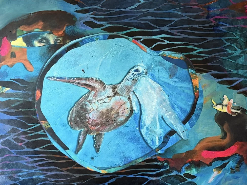My artwork Turtle Eats Plastic aligns with the proverb, "Water, water everywhere, and not a drop to drink." Taken from Samuel Taylor Coleridge's The Rime of the Ancient Mariner, it evokes a sense of irony and desperation; being surrounded by water but unable to drink it.